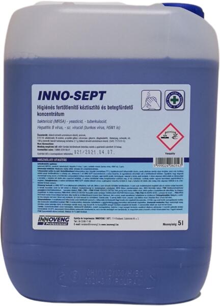 Folyékony szappan fertőtlenítő hatással 5000 ml Inno-Sept Higiénés fertőtlenítő kéztisztító és betegfürdető koncentrátum - antimikrobiális hatásspektrum: baktericid (MRSA) – yeasticid – fungicid – tuberkulocid – Hepatitis B vírus – sz. virucid (burkos vírus, H5N1 is) Alkalmazási feltételek: Alkalmazás hígítás nélkül, behatási idő szobahőmérsékleten Felha