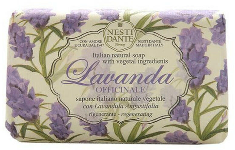 Nesti Dante színszappan toszkán levendula kivonattal. Összetevők: Sodium palmate, Sodium cocoate, Sodium palmkernelate, Aqua, Parfum, Guaiazulene, Glycerin, Tetrasodium etidronate, Tetrasodium EDTA, Sodium Chloride, C. I. 77007