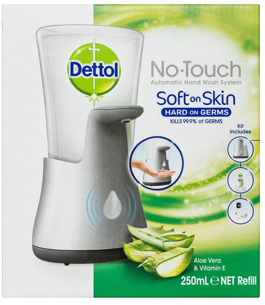 Dettol érintés nélküli kézmosó készülék hidratáló Aloe Vera utántöltővel! A Dettol Érintés Nélküli Kézmosó hatékonyabb és gyakoribb kézmosásra ösztönöz. A rendszer magától adagolja a pont megfelelő mennyiségű hidratáló szappant. A kórokozók így sosem kerülnek rá a kézmosó készülékre. Konyhákban és fürdőszobákban való használatra ideális. A csomag
