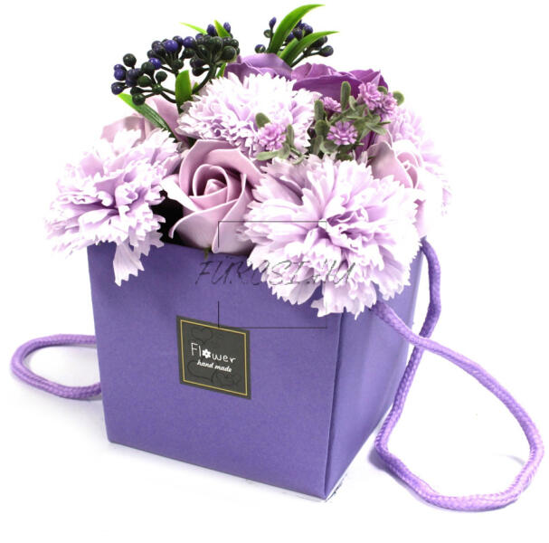 Ez a csokor igazi remekmű. Káprázatos levendulaszínű rózsák és szegfűk színskálája, melyek egy-egy szappanból formált, önmagukban is csodálatos művészeti alkotások. Azok a szappanvirágok, melyek magukban hordozzák az örök szépség ígéretét, és az érzékeknek olyan kényeztetést nyújtanak, melyet csak a legfinomabb alapanyagokból készült termékek képesek nyújtan