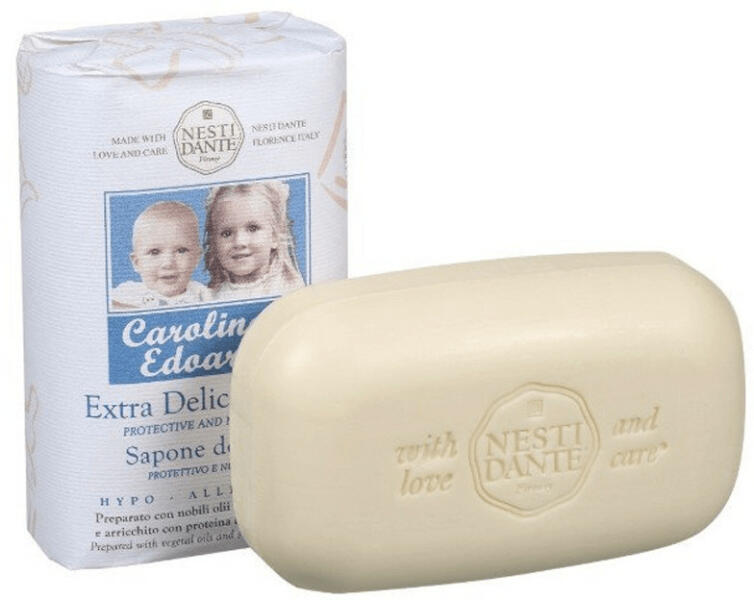 A babák bőre annyira finom és törékeny, hogy csak a legfinomabb szappanokat viseli el. A Carolina és Edoardo különlegesen finom állagú babaszappan semleges kémhatású, bőrkímélő és bőrbarát, édesmandula fehérjét tartalmaz. Bátran alkalmazható a legérzékenyebb bőrű újszülötteknél és felnőtteknél egyaránt. Hipoallergén, bőrgyógyászatilag tesztelt formula. Öss