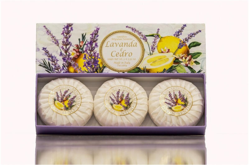 Gyönyörűen illatos olasz természetes szappan. Csomagolva egy díszdobozban. Dermatológiailag tesztelt. Készült Olaszországban. Összetevők: Nátrium-palmiát, nátrium-ko-koát, enzim, glicerin, illatanyag, nátrium-klorid, titán-dioxid, tetrátrium-etridonát, tetranátrium-edta. Súly: 3 x 100 gGyártó: SAPONIFICIO ARTIGIANALE FIORENTINO
