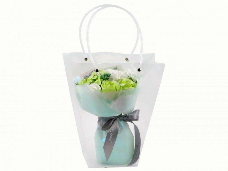 Szappanrózsa virágcsokor zöldes átlátszó dísztasakban 25cm 00981 - Ajándék szappan Befoglaló méretek 24x14x40 cmAnyaga szappan