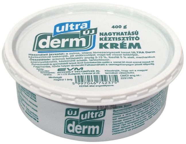 Gyártó: Ultra Derm Modell: Kéztisztító 400g Leírás: Az Ultra Derm egy nagyhatású, különböző felületaktív anyagokat, szennyeltávolítókat, bőrvédő és egyéb adalékanyagokat tartalmazó kéztisztító krém. Az olyan szennyeződéseket is hatékonyan távolítja el, mint a kéz redőibe, pórusaiba bekerülő olajos, zsíros fémpor, rozsda, vagy grafit.