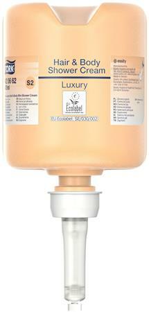 Tork Luxus krémszappan tusoláshoz és hajmosáshoz termék pazar minőségű, 3 az 1-ben élményt kínál; kiváló választás szállodáknak, illetve wellness- és sportlétesítményeknek. A természetes argánolajat és balzsamot tartalmazó termék három feladatra is alkalmas: egyszerre frissítő sampon és balzsam, valamint hidratáló krémtusfürdő. Kíméletesen tisztítja a hajat