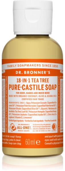 Dr. Bronner’s Tea Tree, 60 ml, folyékony szappanok nőknek, A kényeztető Dr. Bronner’s Tea Tree tusfürdő gél elengedhetetlenül hozzátartozik a mindennapi higiéniához. Gyengéden, mégis kímélően tisztítja és hidratálja a bőrt a teljes testfelületen. Tulajdonságok: lemossa a bőrt és eltávolítja a szennyeződéseket helyreállítja a bőr komfortérzetét bársonyosan fino