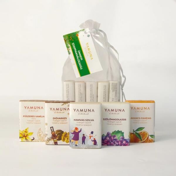 Ünnepi szappanválogatás csomag Kényeztesd magad vagy szeretteidet a YAMUNA ünnepi szappanválogatásával! Ez az exkluzív ajándékcsomag öt különleges, hidegen sajtolt, növényi alapú miniszappant tartalmaz, amelyek egy elegáns organza zsákban érkeznek. Minden szappan bõrbarát, és természetes alapanyagokból készül, hogy gyengéden ápolja és kényeztesse a bõröd. A váloga
