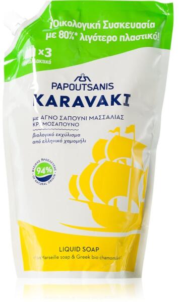 PAPOUTSANIS Karavaki Liquid Soap Pouch Refill With Chamomile, 900 ml, Utántöltők nőknek, A praktikus PAPOUTSANIS Karavaki folyékony szappan kímélően, de hatékonyan tisztítja a kezét, egyben biztosítja számára a szükséges táplálást és ápolást. Tulajdonságok: hatékonyan mossa a kezet ápolja a kéz bőrét Összetétel: legalább 94%-ban természetes eredetű összetevőket t