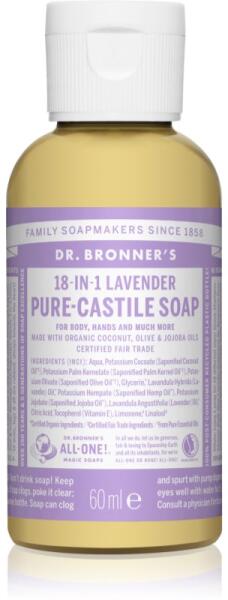 Dr. Bronner’s Lavender, 60 ml, folyékony szappanok nőknek, Tulajdonságok: lemossa a bőrt és eltávolítja a szennyeződéseket helyreállítja a bőr komfortérzetét táplálja és ápolja a bőrt Használata: Vigye fel a nedves kezére és gyengéden habosítsa fel. Zuhanyozás vagy fürdés során alkalmazza. Vigye fel a teljes testfelületre, majd öblítse le meleg vízzel.