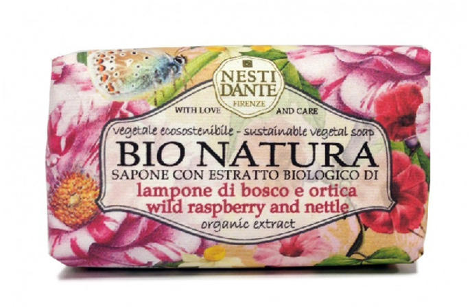 A kompozíció kizárólag a legmagasabb minőségű természetes olíva- és pálmaolajat, valamint bio illóolajokat tartalmaz. A készítményben található málna és csalán kivonat nagy mennyiségű vitamint és ásványi anyagot (C, vas, mangán, kálium, kalcium és karotin) tartalmaz. A szappan puhítja és táplálja a bőrt, feltölti vitaminokkal. A Nesti Dante szappan kiváló minős