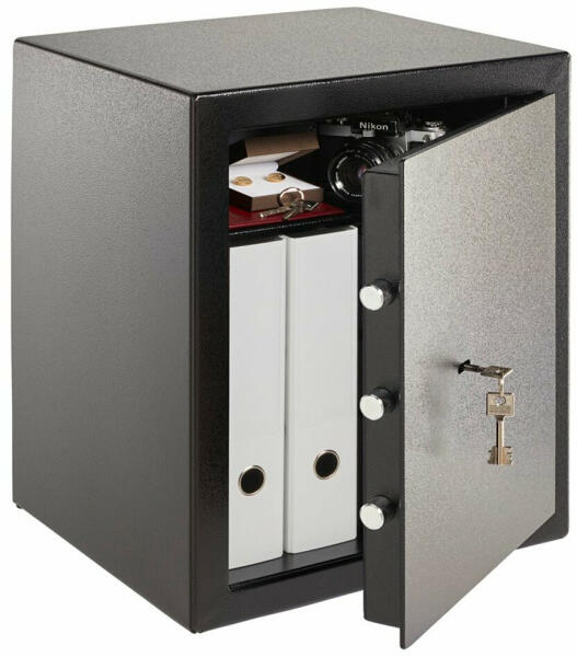 ISS-Vaihingen 6 tűzálló irodai széf 30 perces tűzállóság dokumentumok részére 840C-on a belső hőmérséklet 150C alatt marad duplafalú acél test, speciális hőszigetelő töltettel 78 mm vastag, duplafalú acél ajtó, speciális töltettel speciális füst, - és vízszigetelő tömítés az ajtóban 180 fokos ajtónyitás a külső zsanéroknak köszönhetően háromirányú zár