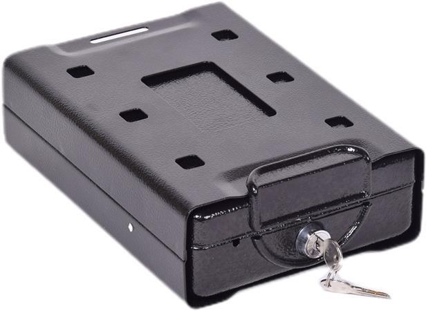 mobil értéktároló masszív acéllemez kazetta és tartó kazetta belseje puhán bélelt alkalmas késméretű értéktárgyak megóvására például mobiltelefon, MP3 lejátszó, navigáció, Ipod felszerelhető autóba, lakókocsiba, hajóra, irodába rögzíthető a furatokon keresztül lefelé vagy 3mm-es, 90cm hosszú acél sodronnyal egyszerű lamellás zár, kettő darab kulccsal fekete