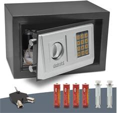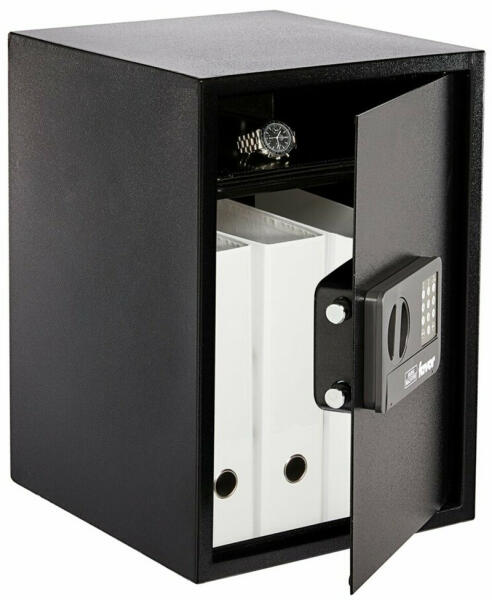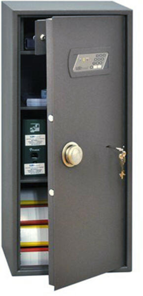 egyfalú széf digitális számzárral 1,5 mm-es egyfalú acél test 3 mm vastag acél ajtó 90 fokos ajtónyitás jobboldali zsanérokkal egyirányú zárás 16 mm-es acél hevederekkel elektronikus számkombinációs zár fólia billentyűzet, külső elemtartóval 1-8 számjegy közötti felhasználói kód 3 téves kódbevitel után 5 perces büntetőidő mechanikus vésznyitási lehetőség k