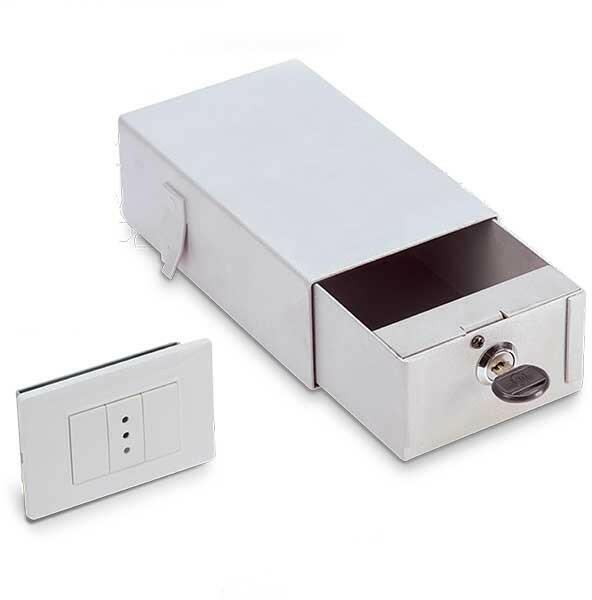 falba építhető rejtett széf 2 mm vastag acéllemez ház kihúzható, zárható belső rekesz piros szőnyeg borítás elektromos hálózatba nem köthető fehér konnektor előlap szerelőlemezen dugalj és a keret könnyen cserélhető többi csatlakozóaljzathoz igazítható megnehezíti a felismerést SM 2-nél plusz alsó rekesz kettő darab kulccsal schuko aljzattal szállítjuk falba ép