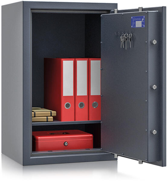 DIN 4102-A1 szerinti tűzálló szigetelés minőségi duplafalú bútorszéf otthonába, irodájába 35 mm vastag hőszigetelt duplafalú acél test 45 mm vastag ajtó, 5 mm-es acél borítással 90 fokos ajtónyitás erős jobboldali zsanérokkal egyirányú zárás 24 mm-es forgó acél hevederekkel mangán acéllappal védett zárszerkezet (fúrás ellen) SecuSafe duplatollú kulcsos zár, 2 d
