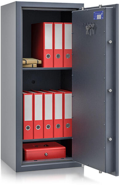 otthoni páncélszekrény MSZ EN 1143-1 szerinti EU 1 ellenállási fokozat 25 mm vastag, többrétegű acél test 84 mm vastag, többrétegű acél ajtó 12 mm-re kiálló, ajtóra simuló fém kilincs 180 fokos ajtónyitás, erős külső zsanérokkal háromirányú zárás, 25 mm-es kerek, acél hevederekkel erős rögzítő rudak a zsanéroldalon (zsanérlevágás ellen) felfúrás ellen mang