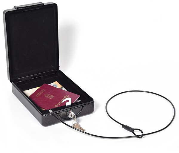 mobil értéktároló masszív acéllemez kazetta és tartó kazetta belseje puhán bélelt alkalmas késméretű értéktárgyak megóvására például mobiltelefon, MP3 lejátszó, navigáció, Ipod felszerelhető autóba, lakókocsiba, hajóra, irodába rögzíthető a furatokon keresztül lefelé vagy 3mm-es, 90cm hosszú acél sodronnyal egyszerű lamellás zár, kettő darab kulccsal fekete