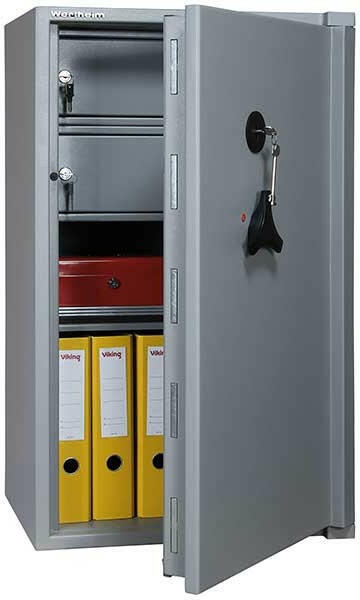 Wertheim-AM 25betontöltetű páncélszekrény passzív zárral DIN 4102 szerinti tűzálló szigetelés többrétegű acél test (vékonyított a maximális térfogatért) 80 mm vastag, többrétegű acél ajtó (szervizkulcsos) 25 mm-es speciálisan megerősített beton töltet a testben és az ajtóban (lángvágás és flexelés ellen) 25 mm-re kiemelkedő csillag alakú kilincs és zsanér 18