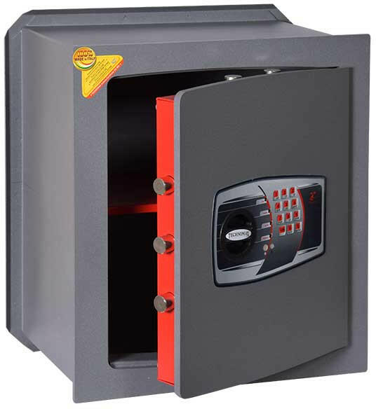 Technomax-DT 7 fali trezor elektronikus zárral 2 mm-es trezor test megerősített 10 mm-es előlappal 10 mm-es lézervágott edzett acél ajtó 90 fokos ajtónyitás rejtett zsanérokkal egyirányú (DT 3-ig) vagy háromirányú (DT 4-től) zárás 22 mm-es kerek acél hevederekkel felfúrás ellen mangán acéllappal védett zárszerkezet elektronikus számkombinációs zár fólia billentyűzet