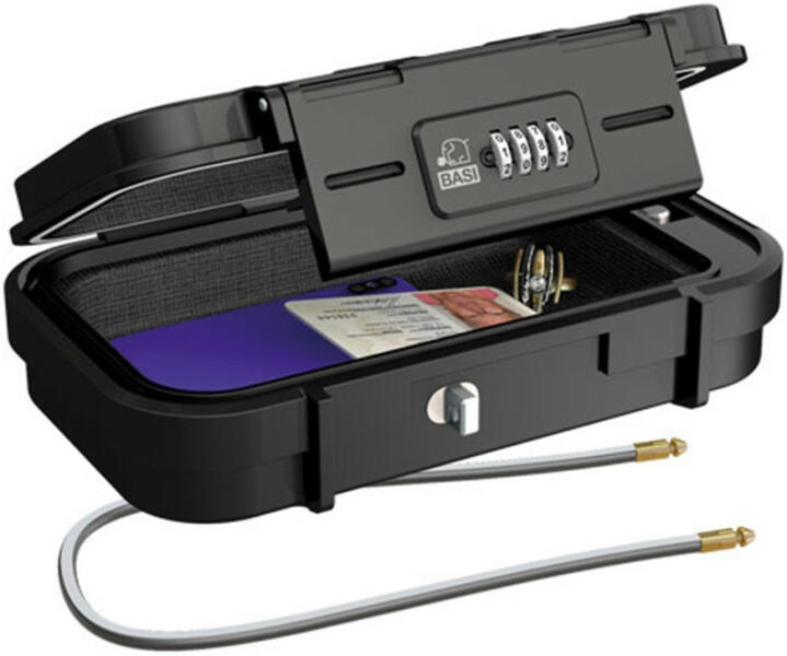 Basi-MSZ 200 vízvédett mobil értéktároló törésálló ABS műanyag kazettavíz elleni védelem (IPX5 minősítéssel)puhán bélelt belsőnégy tárcsás számzárátkódolható számkombináció5 mm átmérőjű, 54 cm hosszú rögzítő sodronyfelszerelhető autóba, lakókocsiba, hajóbaalkalmas késméretű értéktárgyak megóvásárapéldául pénztárca, útlevél, mobiltelefon, nav