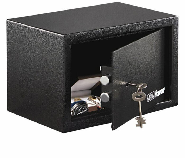 széf kulcsos zárral egyfalú széf duplatollú kulcsos zárral1,5 mm-es egyfalú acél test3 mm vastag acél ajtó90 fokos ajtónyitás jobboldali zsanérokkalegyirányú zárás 16 mm-es acél hevederekkellamellás duplatollú biztonsági zárkettő darab 74 mm-es kulccsalkét rögzítő furat hátrafeléfekete színben, rögzítő csavarokkal áruljuk