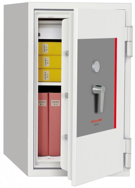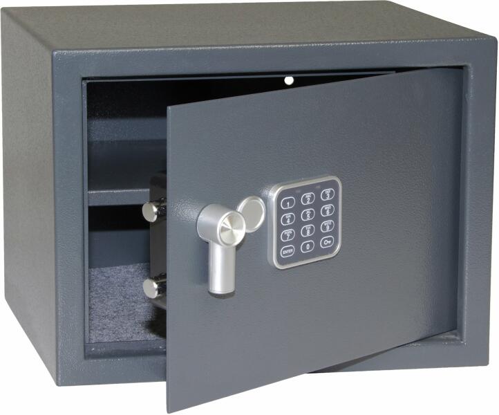 tűzvédett bútorszéf elektronikus zárral DIN 4102-A1 szerinti tűzálló szigetelés minőségi duplafalú bútorszéf otthonába, irodájába C 310-nél 32 mm, C 340-nél 42mm vastag hőszigetelt duplafalú acél test 48 mm vastag ajtó, 5 mm-es acél borítással 90 fokos ajtónyitás erős jobboldali zsanérokkal egyirányú zárás 24 mm-es forgó acél hevederekkel mangán acéllappal vé