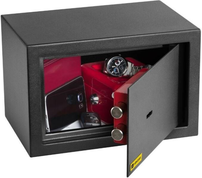 duplafalú bútorszéf kulcsos zárral 40 mm vastag, duplafalú acél test50 mm vastag, duplafalú ajtó, 3 mm-es acél borítással90 fokos ajtónyitás rejtett zsanérokkalháromirányú zárás, 20 mm-es kerek, acél hevederekkelfelfúrás ellen mangán acéllappal védett zárszerkezetduplatollú kulcsos zár, 2 db 65 mm-es kulccsalfinomnyitás elleni védelem1 db állítható magasságú polc