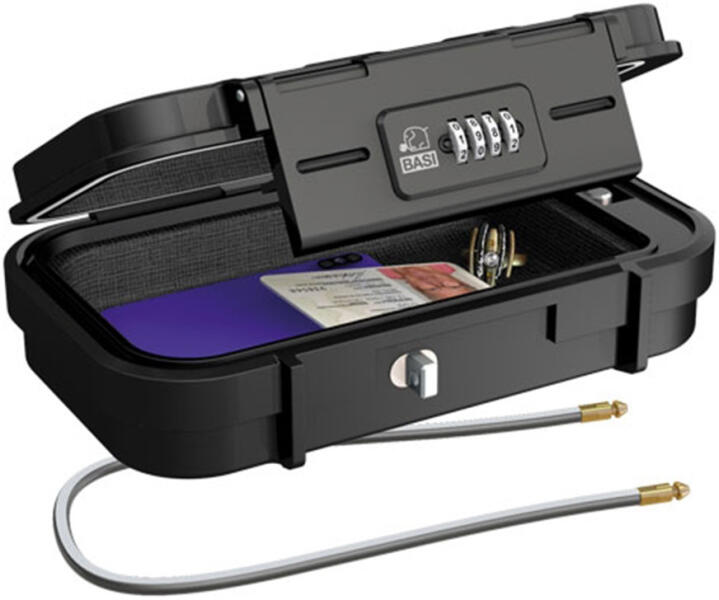 vízvédett mobil értéktároló törésálló ABS műanyag kazettavíz elleni védelem (IPX5 minősítéssel)puhán bélelt belsőnégy tárcsás számzárátkódolható számkombináció5 mm átmérőjű, 54 cm hosszú rögzítő sodronyfelszerelhető autóba, lakókocsiba, hajóbaalkalmas késméretű értéktárgyak megóvásárapéldául pénztárca, útlevél, mobiltelefon, navigáció