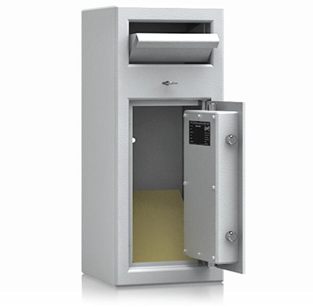 bútorszéf bedobó szerkezettel lefelé nyíló csúszdás bedobó szerkezetbedobó nyílás külön zárható (2 db kulccsal)maximális kihalászás elleni védelem3 mm vastag egyfalú acél test52 mm vastag duplafalú ajtó, 6 mm-es acél borítással90 fokban jobbra nyíló ajtó, belső zsanérokkalháromirányú zárás, kerek acél hevederekkelfelfúrás ellen mangán acéllappal védett z