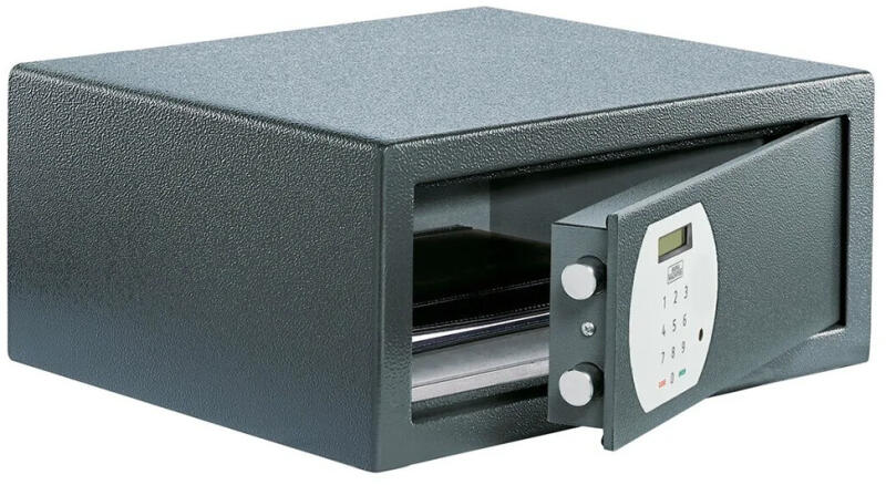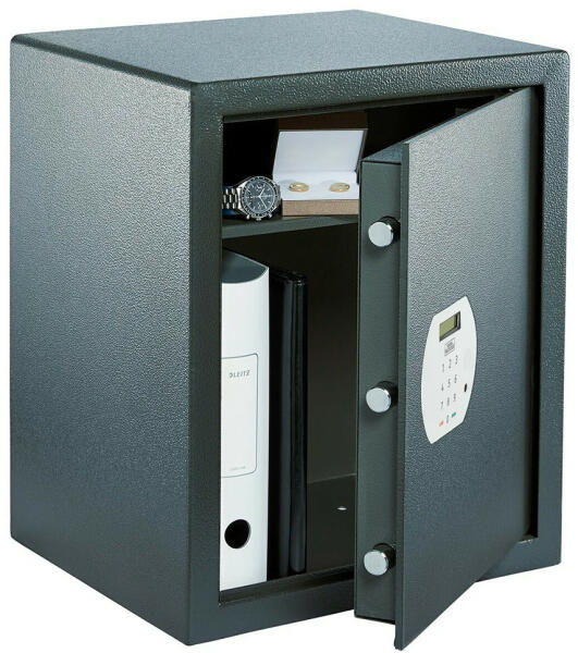 megbízható laptop széf elektromos zárral2 mm-es egyfalú acél test48 mm vastag ajtó, 6 mm-es acél borítással90 fokos ajtónyitás jobboldali zsanérokkalegyirányú zárás 22 mm-es acél hevederekkelmotoros működtetésű elektronikus számzárfólia billentyűzet egysoros LCD kijelzővel3-6 számjegy közötti felhasználói kód és8 számjegyű vésznyitó kód programozásamechaniku