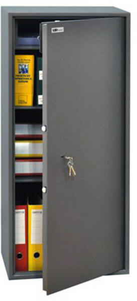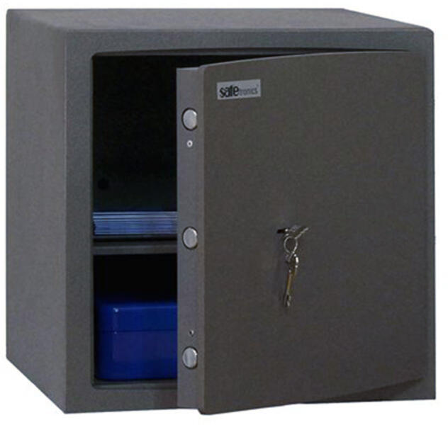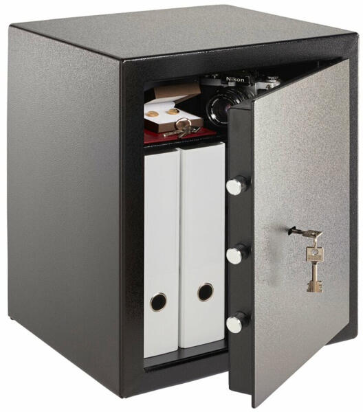 tűzvédett bútorszéf kulcsos zárral DIN 4102-A1 szerinti tűzálló szigetelés minőségi duplafalú bútorszéf otthonába, irodájába 35 mm vastag hőszigetelt duplafalú acél test 45 mm vastag ajtó, 5 mm-es acél borítással 90 fokos ajtónyitás erős jobboldali zsanérokkal egyirányú zárás 24 mm-es forgó acél hevederekkel mangán acéllappal védett zárszerkezet (fúrás ellen