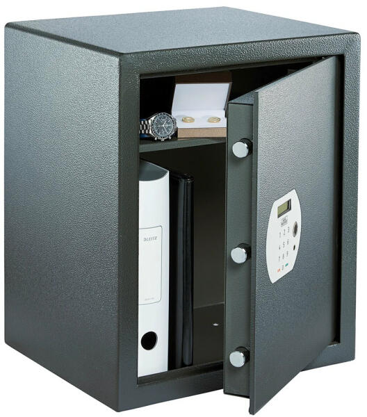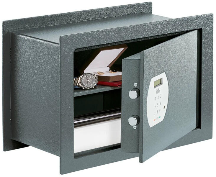 falba építhető széf elektromos zárralmegbízható kompakt faliszéf otthonába2 mm-es acél test, 4 mm-es hátfallal48 mm vastag ajtó, 6 mm-es acél borítással90 fokos ajtónyitás jobboldali zsanérokkalegyirányú zárás 22 mm-es acél hevederekkelmotoros működtetésű elektronikus számzárfólia billentyűzet egysoros LCD kijelzővel3-6 számjegy közötti felhasználói kód és8 s