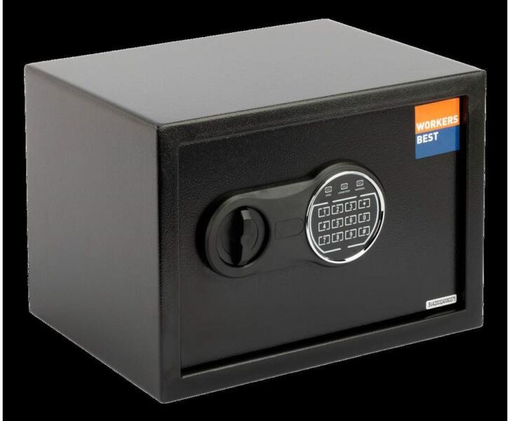 megbízható laptop széf elektromos zárral belső világítás (automatikusan kikapcsol) 2 mm-es acél test, 5 mm-es acél ajtó 90 fokos ajtónyitás jobboldali zsanérokkal egyirányú zárás 18 mm-es kerek acél hevederekkel motoros működtetésű elektronikus számkombinációs zár világító gumi billentyűzet, egysoros LED kijelző egy mesterkód (6 számjegy) és egy felhasználói k