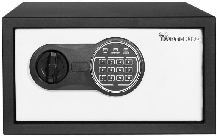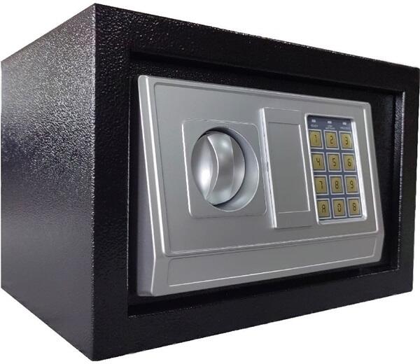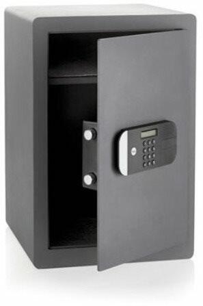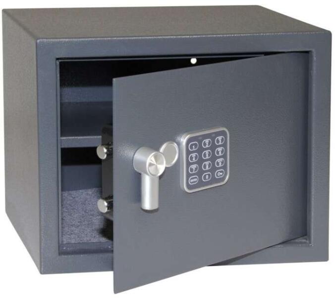 Szürke Acél széf elektronikus zárral, számbillentyűzettel és karral a kényelmes kinyitáshoz. Három egymás után hibásan megadott kód után a széf automatikusan ideiglenesen blokkolódik. Szabadon választható 3-8 jegyű számkóddal lehet ellátni így 100 000 000 kombináció lehetséges. Akkumulátor töltöttségi szintjének kijelzésével. Külső méretei Sz / Ma / Mé: 380 x