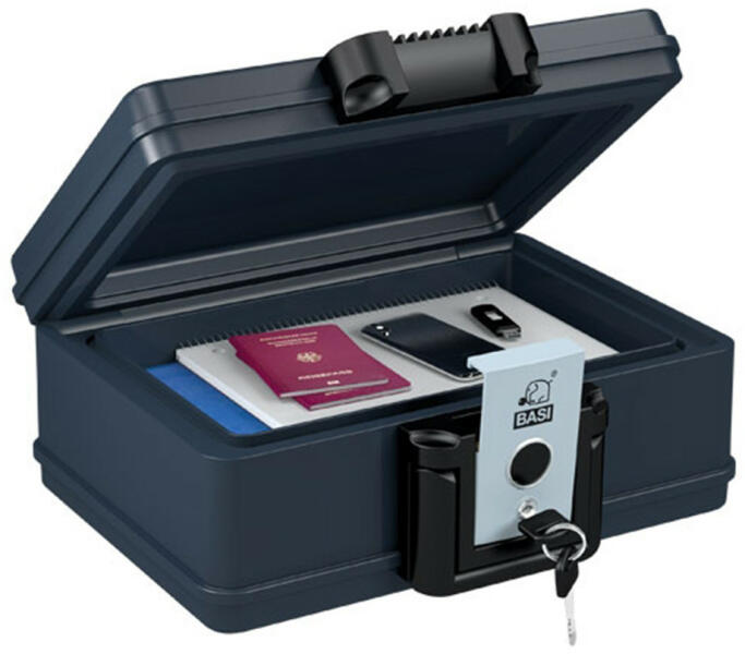 Basi-DB 210 S tűz- és vízálló kazetta tűz- és vízálló kazetta30 perces tűzvédelemspeciális hőszigetelő töltetkörbefutó gumi tömítészárható fedél, 2 db kulcsműanyag hordozó fogantyúDIN EN 15659 szerint bevizsgálva845C-on 30 percig 172C alatt marad a belső hőmérsékletiratok, CD, DVD, USB-meghajtó, memóriakártya, merevlemez tárolására ajánlott