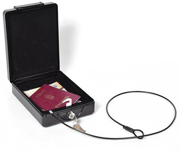 KingSAFE-Car Safe mobil értéktároló masszív acéllemez kazetta és tartó kazetta belseje puhán bélelt alkalmas késméretű értéktárgyak megóvására például mobiltelefon, MP3 lejátszó, navigáció, Ipod felszerelhető autóba, lakókocsiba, hajóra, irodába rögzíthető a furatokon keresztül lefelé vagy 3mm-es, 90cm hosszú acél sodronnyal egyszerű lamellás zár, kettő dar