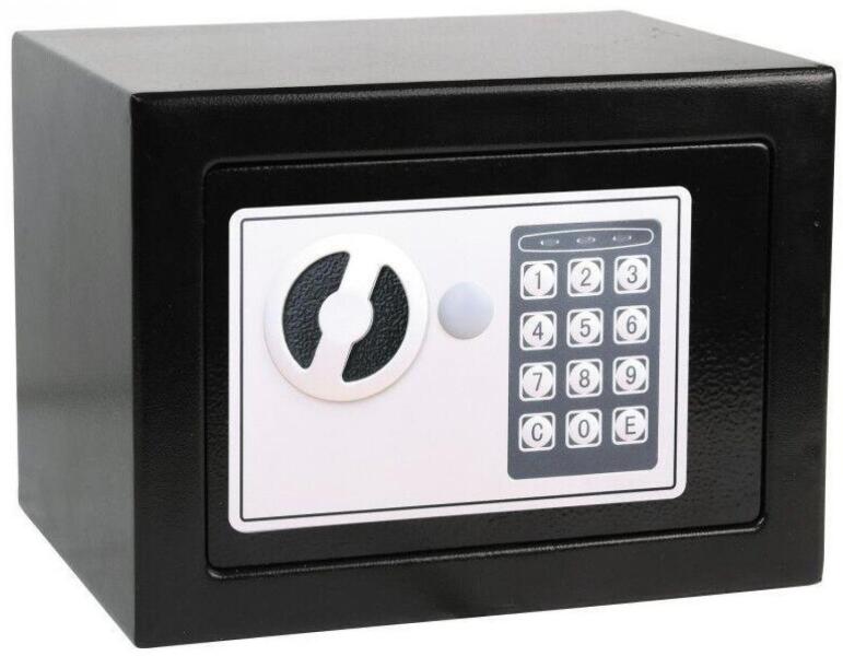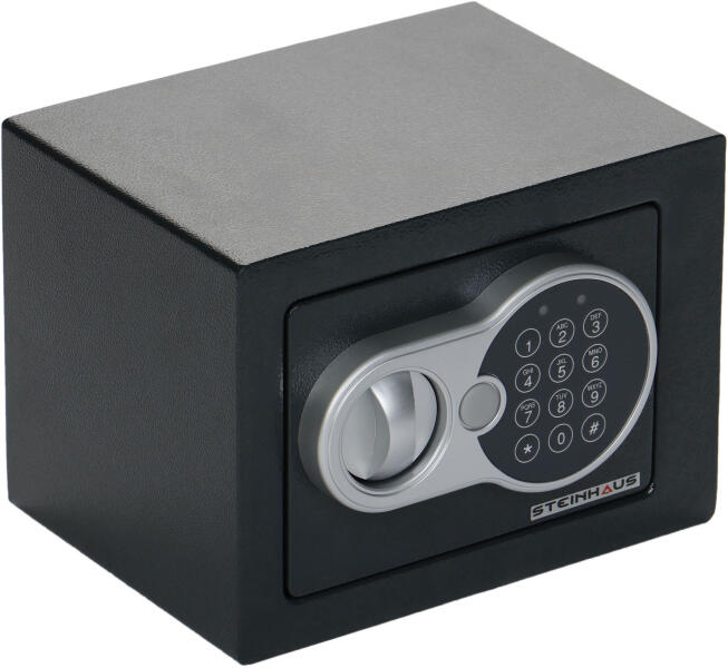 Steinhaus Elektronikus acél széf + kulcs, 170x230x170 mm, Szürke Az elektronikus széf apartmanok, szállodák és motelek számára ajánlott. Ideális pénz vagy más értékek tárolásához. Zárási típus: Zárás / Elektronikus nyitás számjegyek kombinációjával, 3-8 számjegyű kód, 4 db AA típusú 1.5V elem; Manuális kulcs biztonságos nyitás rendszer, ha elfelejtette a program