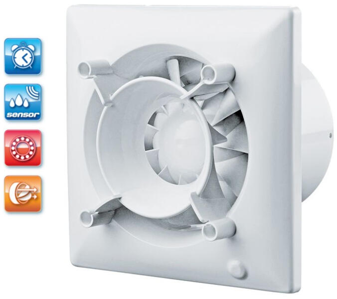 A ventilátor a fürdőszobák, zuhanyzók, konyhák és egyéb helyiségek mindennapos szellőztetésére szolgál. Alacsony és közepesen erős légáram a rövid csőszakaszi elszíváshoz, alacsony légellenállással. Időzítővel és páraérzékelővel ellátott. A ventilátor teljesen kompatibilis a 100 mm átmérőjű csövekkel és PVC-tartozékokkalPáraérzékelő Páratartalom-érz