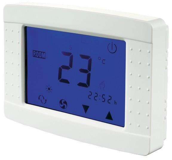 Alkalmazható ventilátor vezérlésére és fan coilok és légfűtő egységek 230 V-os háromsebességes ventilátorok működtetésére. A háttérvilágítással rendelkező LCD kijelző lehetővé teszi a szobatermosztát használatát akár gyenge fényviszonyok között is. A kijelzőn látható az aktuális és a beállított beltéri léghőmérséklet, a kiválasztott hűtési, fűtési