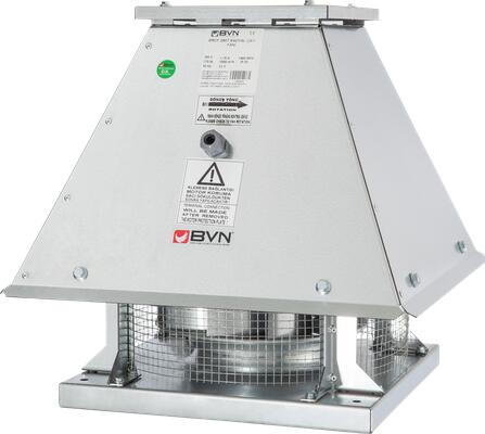 Ventilátor alkatrészek és anyagtulajdonságok: A BRCF sorozatú centrifugál (radiális) tetőventilátorok szerelőlemeze, burkolata és járókereke magas korrózióállóságot biztosító horganyzott acéllemezből készült, kivéve A BRCF 630 - 800 modellek, melyek festett acéllemezből készülnek. Minden modell aszinkron motorral rendelkezik, amely a légáramlaton kívül kerül elhel