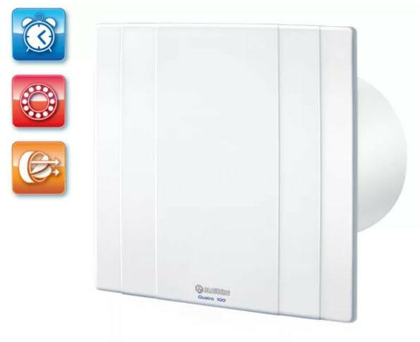 BLAUBERG QUATRO 100 T UV-álló ABS műanyagból készült, fürdőszoba, zuhanyzó, konyha és egyéb használati helyiség folyamatos vagy időszakos elszívására. Dekoratív előlapos háztartási ventilátor, 100 mm légcsatornához, időrelével. Golyóscsapágyas kivitel. Konstrukció: Ezek a modellek golyóscsapágyakkal és visszacsapó szeleppel vannak felszerelve. A BLAUBERG ventiláto