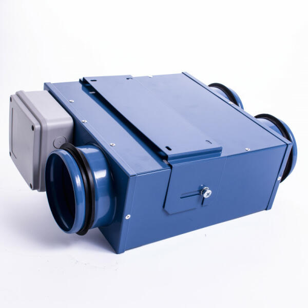 Megabox radiális ventilátor, Előrehajló lapátozású járókerékkel Ház : Kettősfalú, horganyzott acéllemez ház, 50 mm vastagságú, ásványgyapot szigetelőanyaggal bélelve. A szívó− és nyomóoldali kerek csatlakozócsonkok, gumi− ajkas tömítéssel vannak ellátva. Tisztítási, karbantartási munkákhoz a motorjárókerék egység teljesen kihajtható. A ház stabil szerel