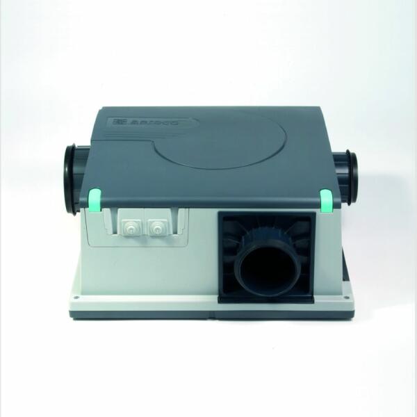 V2A 032 hangcsillapított, fordulatszám szabályozott központi ventilátor Szívócsonkok mérete: Ø80mm vagy Ø100 mm Kifúvó csonk mérete: Ø100 mm A V2A két helyiséget szívó akusztikus központi ventilátor. A folyamatos üzemelésre tervezett EC motorját egy nyomtatott áramkör vezérli, ami a fordulatszám szabályozást is végzi. Az állandó fordulatszám és a különleges jár