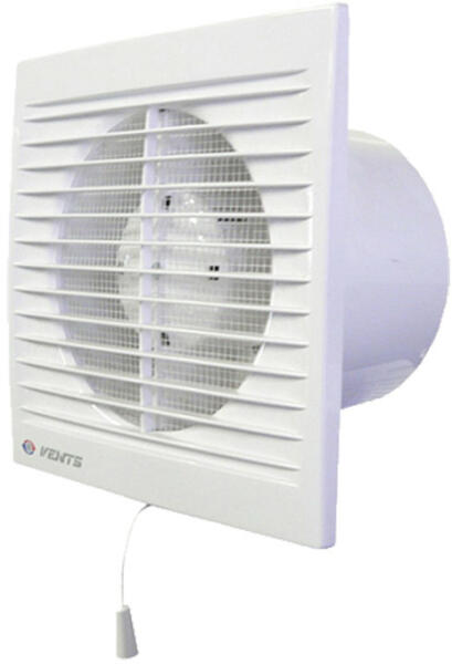 Vents 100 SV axiális fürdőszobai ventilátor húzókapcsolóval rövid csőszakaszú elszívásra pl. a konyhába, fürdőszobába, mellékhelyiségbe. A motor csúszócsapággyal van ellátva a halk üzemelés érdekében, élettartama kb. 5000 óra. Modern tervezés, esztétikus megjelenés, magas tevékenység és hosszú élettartam. A ventilátorház és a járókerék jó minőségű ABS