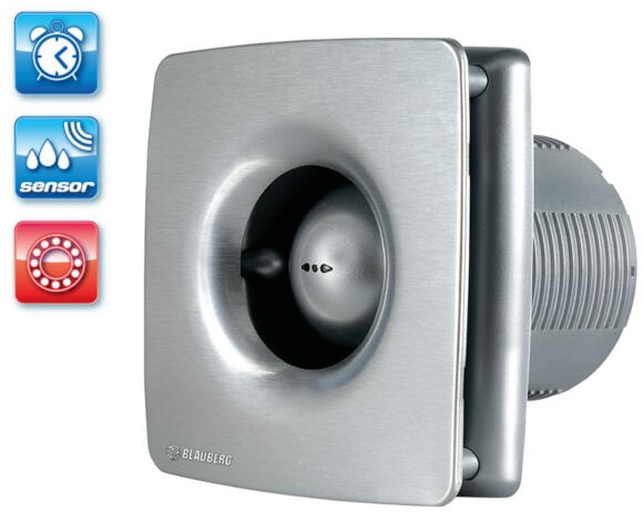 Blauberg axiális kialakítású ventilátor, 100 mm. Halk működéssel és visszaáramlás enyhítő felépítéssel. Modern "JET" design előlap. Pára érzékelővel és időzíthető kikapcsolás funkcióval.