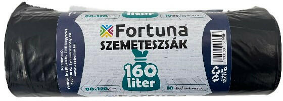 Szemeteszsák FORTUNA 160L fekete 80x120 cm 10 darabos Fekete színű szemeteszsák háztartási és irodai célra. Termékadatok: Záródása: sima Űrtartalom: 160 literes Vastagság: 30 mikronos Kiszerelés: 10 db/ tekercs Méret: 80x120 cm