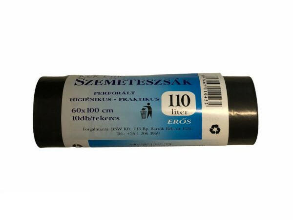 Erős szemeteszsák, perforált, 110 L-es. Méret: 60x100 cm Vastagság: 22 mikron Szín: fekete Kiszerelés: 10 db/tekercs