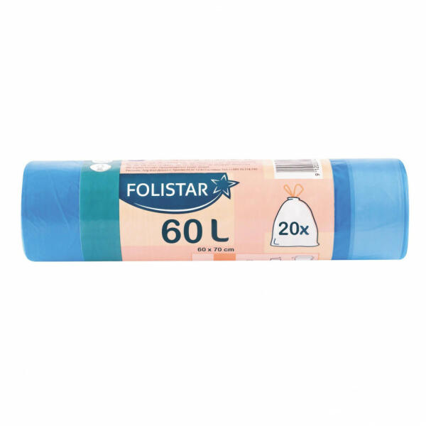 Folistar HNAT szemeteszsák 64x70cm, 60 literes HDPE 15 mikron kék, szalagos, 20 darab/tekercs - szín: kék - zárószalaggal, húzó zárszalaggal - méret: 64 x 70cm - 60 liter - anyagvastagság: 15 mikron - alapanyag: HDPE - kiszerelés: 20 db / tekercs - gyűjtő: 24 tekercs