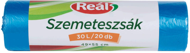 SZEMETESZSÁK 30 LITER 49 X 55 CM 20 DB/TEKERCS REÁL KÉK Szemeteszsák 30 liter 20 db/tekercs Méret: 49 x 55 cm Színe: kék Kiszerelése: 20 zsák/tekercs Katalóguskód: 55734