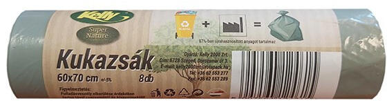 Szemeteszsák KELLY super nature 60x70 cm 60L 8 db/tekercs A termékek újrahasznosított anyagból készültek. A zsákok vastag falúak, erősek, ezért kiválóan alkalmasak lomtalanításra, kerti hulladék gyűjtésére. Méretei: 60 l, 110 l, 200 l, 240 l.